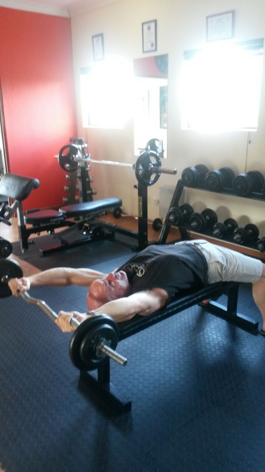 - Inhale and expand the chest as much as possible, lowering the barbell behind the head bending slightly at the elbows.