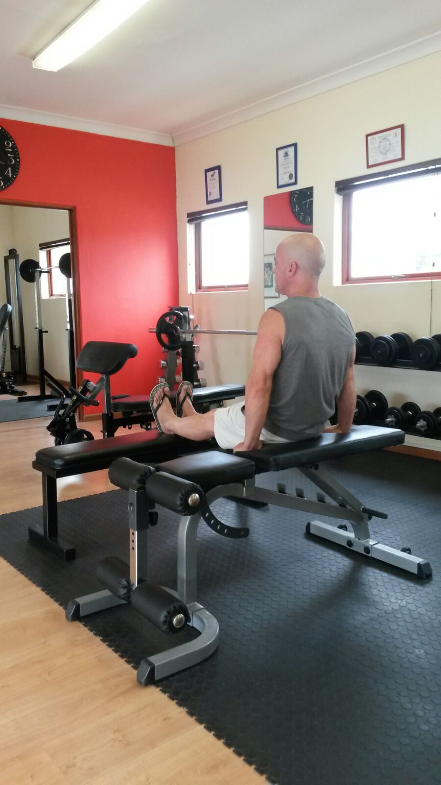 Suspend the body between two benches by placing the hands on the edge of one bench and the feet on the edge of the other bench.